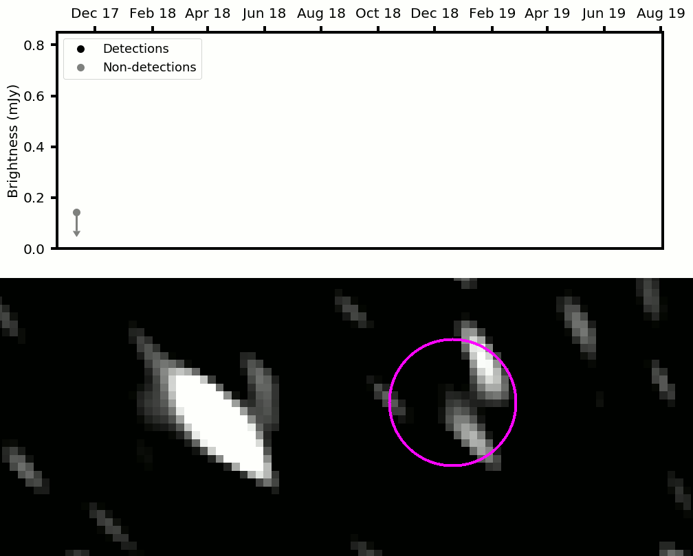 The light curve of the newly discovered flaring source MKT J170456.2-482100, and the images corresponding to the light curve (the position of MKT J170456.2-482100 is circled in pink). These images were taken weekly.