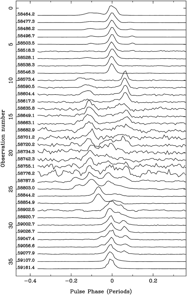 Lovell Telescope and MkII Telescope total intensity profiles of XTE J1810-197 between 2018 and 2021. This plot shows how the profile has changed over time.